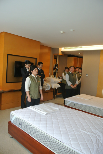 20147171400,由華盛江泉城酒店承辦的華盛江泉集團第四屆“勞動之星”職業技能競賽中式做房項目的實操比賽在酒店主樓803房間進行。參加本次比賽的選手共有43人,經理論考核,成績領先的20名員工進入了實操決賽。